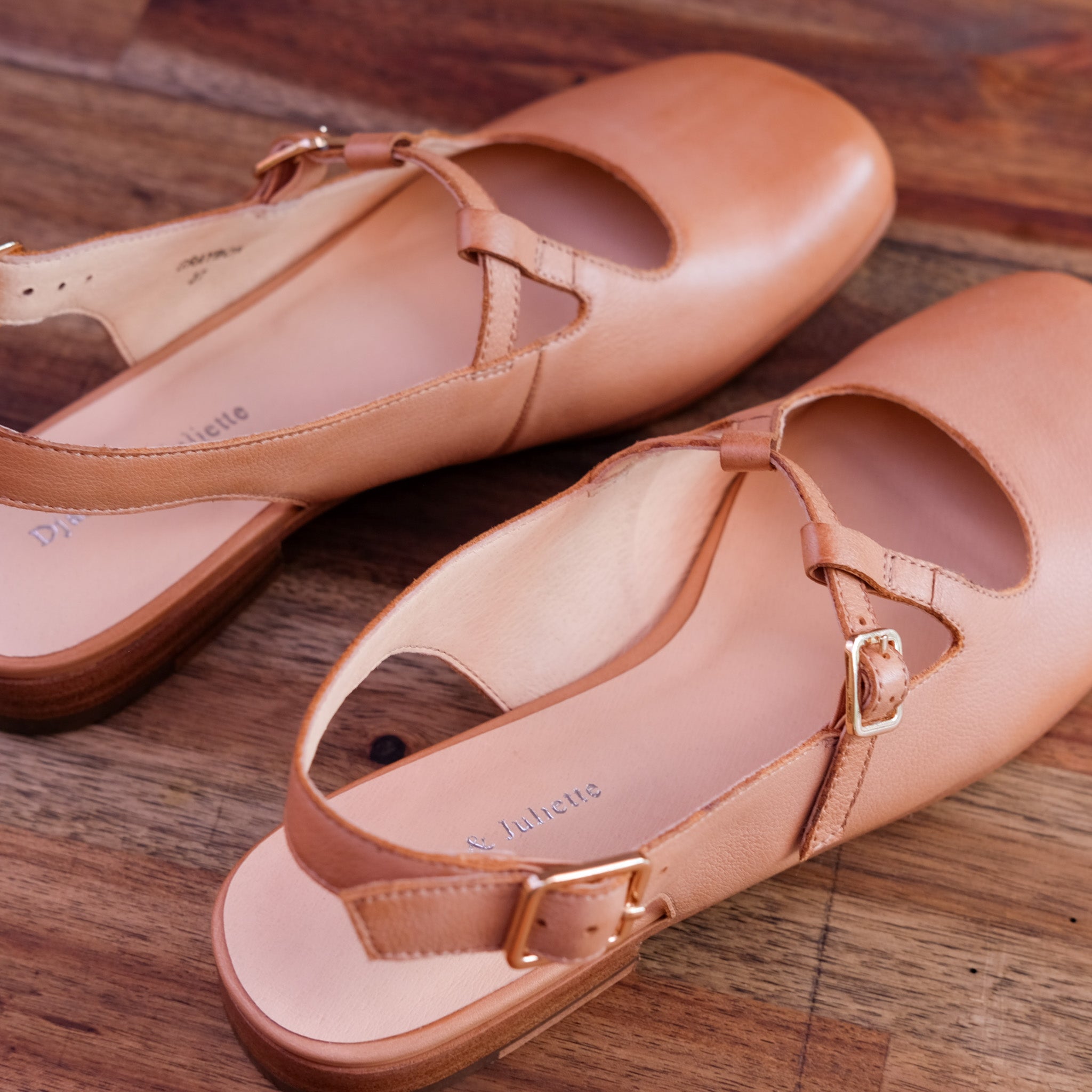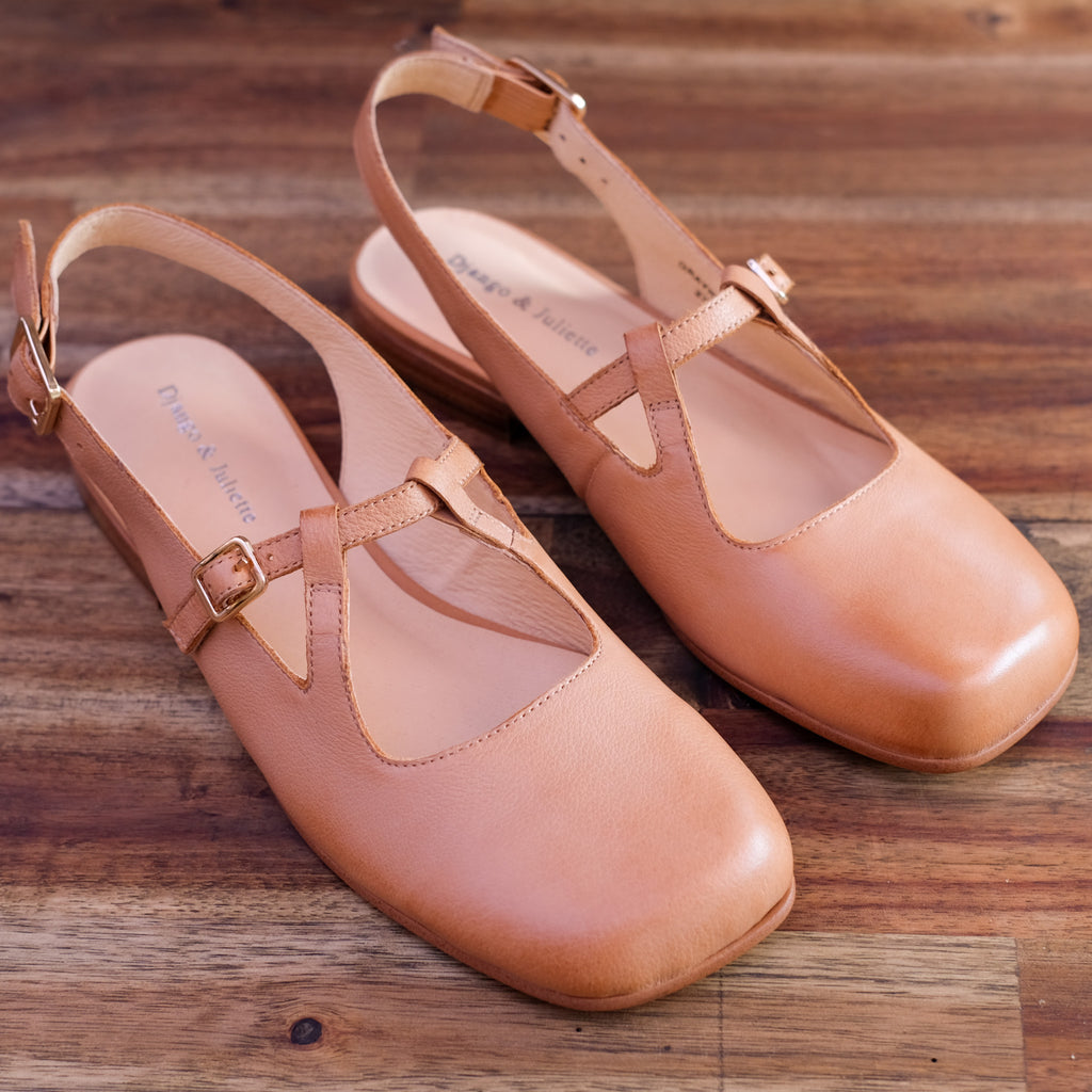 Super cute and on trend, Grayson is a modern twist on the classic Mary-Jane. This closed toe slingback that with take you smoothly from day to night. Available in a beautiful soft tan that is burnished at the toe, these gorgeous shoes will look amazing with wide legs pants and a simple white shirt for more formal days or a pretty frock for casual days.