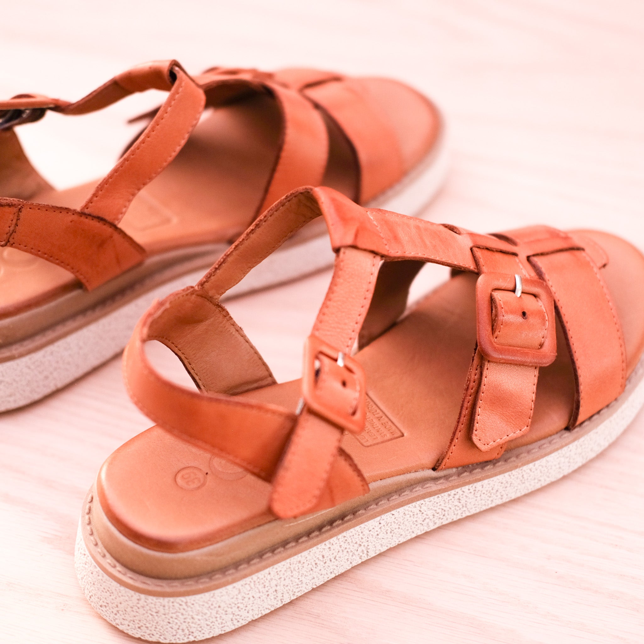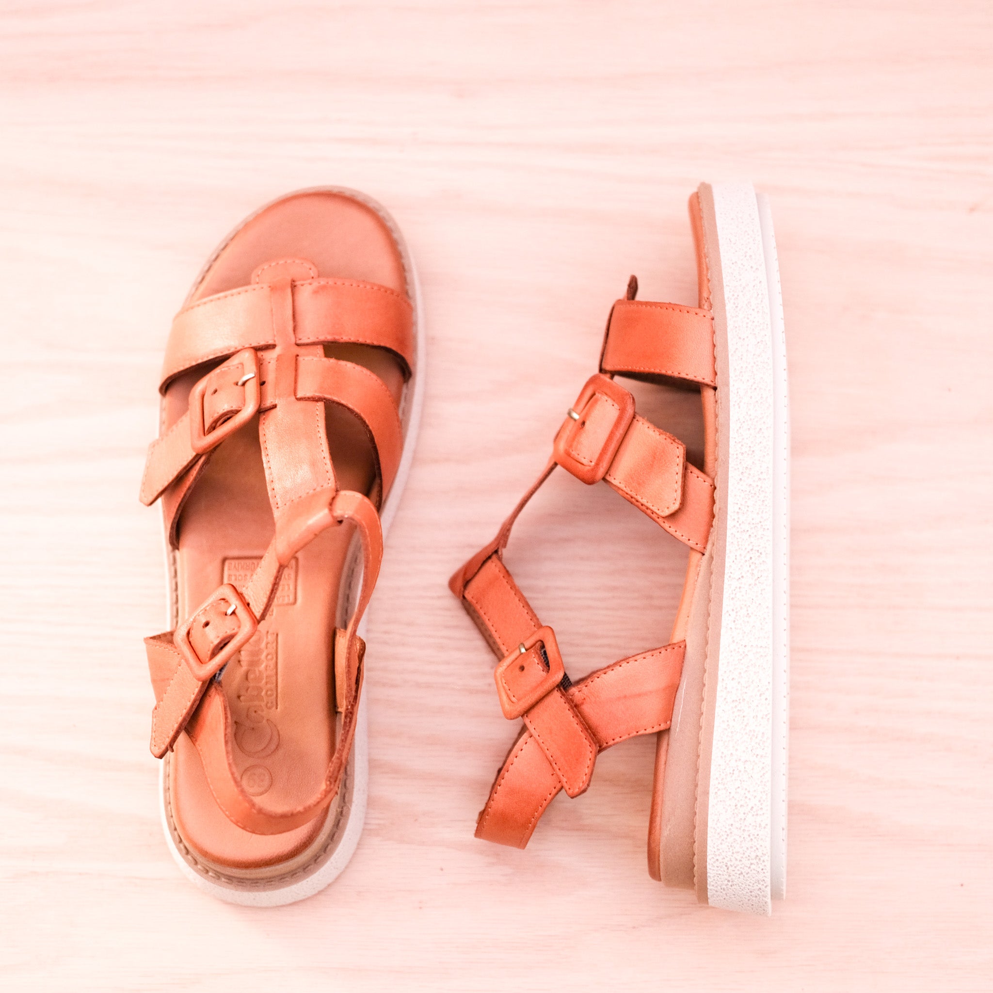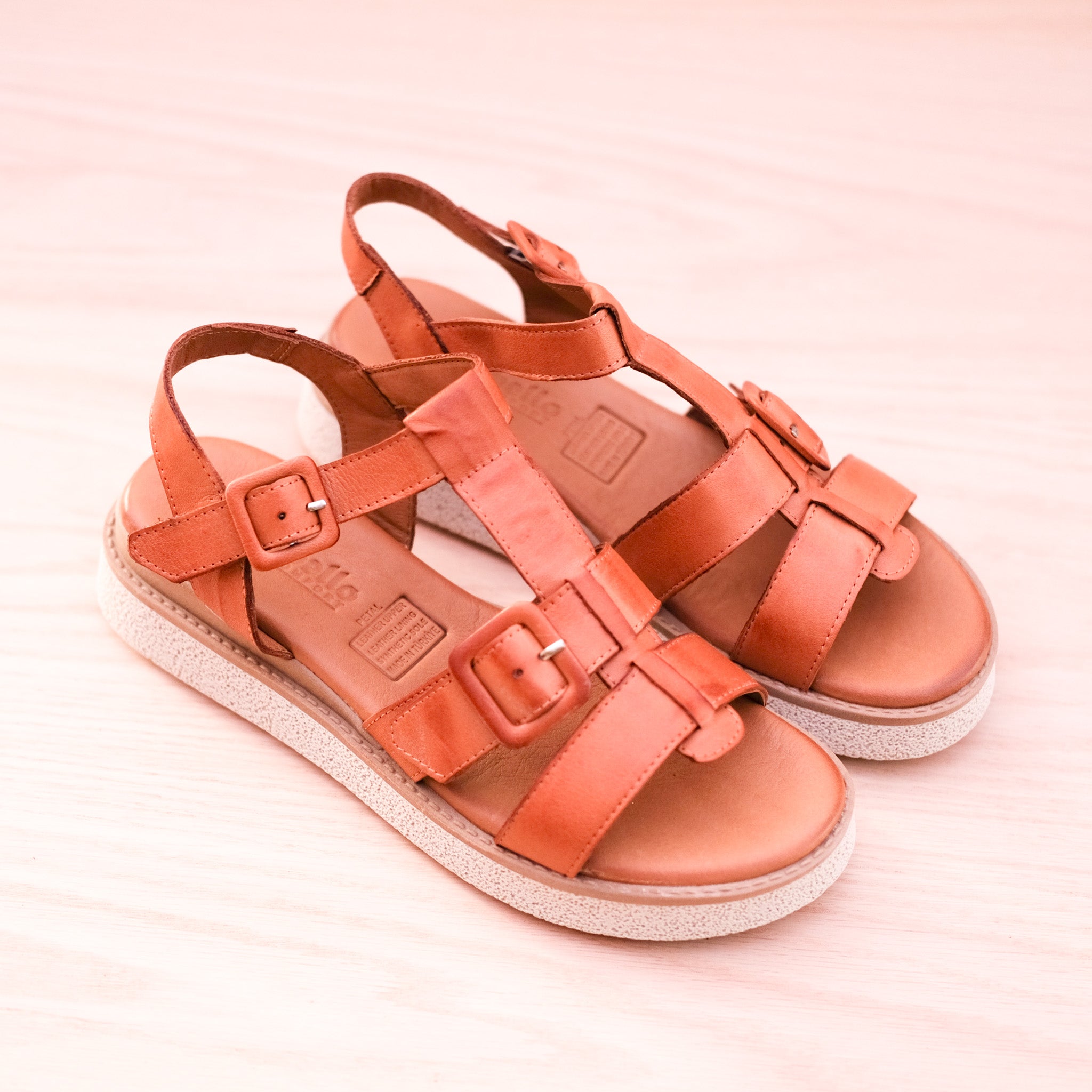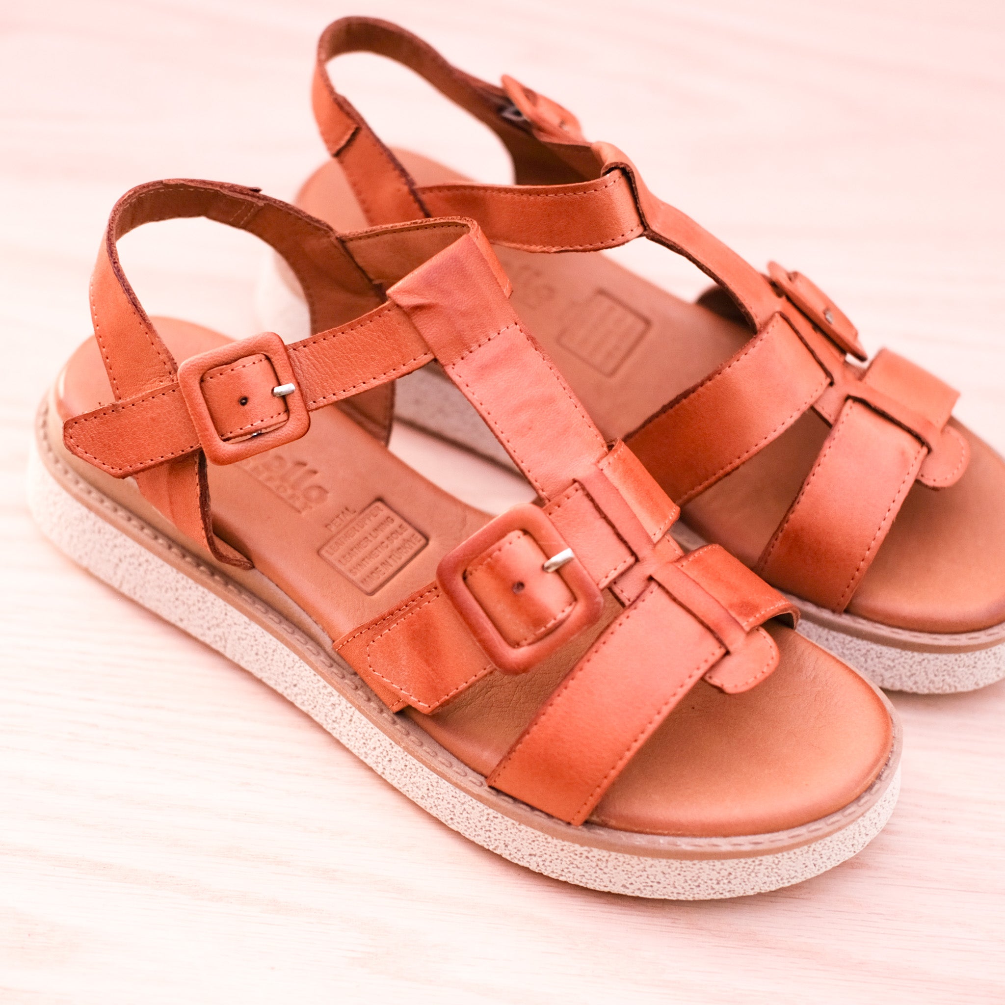 You will just adore Petal from customer favourites Cabello. Handmade in Turkey from the softest leather, these lovely sandals hug across the foot and secure behind with a stylish leather covered buckle. The footbed has a memory foam footbed inside that will keep your feet happy all day long. The outsole combines a leather wrapped midsole and a rubber outsole for super comfort all day long. The heel raises to a comfortable 3.5cm on the wedge sole. Available in tan.